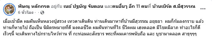 เสี่ยเบิรด์เผยว่า เมื่อช่วงเช้ามืดที่ผ่านมา ได้ฝันเห็นหลวงปู่สรวงเดินมาหาที่บ้านในพื้นที่ สุวรรณ อยุธยา
