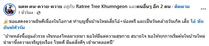 ทั้งนี้ เพื่อนฝูงและผู้ใหญ่หลายท่านต่างร่วมอวยพรให้บ้านหลังใหม่นี้เป็นแหล่งรวมของความสุข
