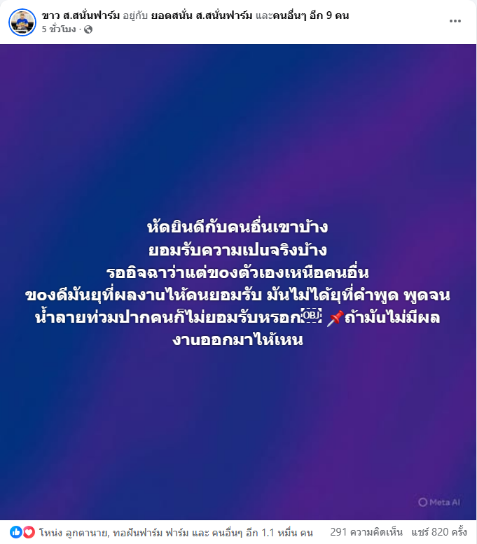 ข้อความดังมุงเน้นเรื่อง น้ำหนักของผลงานจริง มากกว่า “คำพูดสร้างภาพ” และการแข่งกันอวดเหนือกันบนโลกโซเชียล