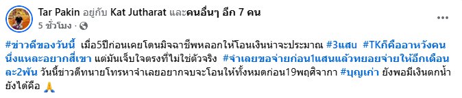 หลังจากที่โดนมิจฉาชิพหลอกเงินไปประมาณ 300,000 บาท เมื่อ 5 ปีที่แล้ว และในที่สุดวันนี้ ทนาย แจ้งข่าวดีให้กับ ผู้เสียหายรายอื่นๆ ร่วมไปถึง เสี่ยต้าทีเค และทางเสี่ยต้า ได้ออกมาโพสต์เฟสส่วนตัวว่า