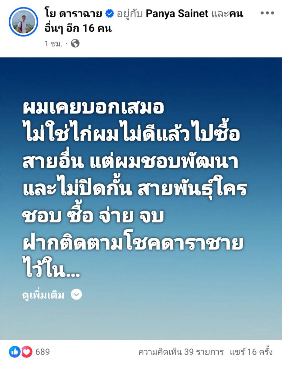 ถือเป็นอีกหนึ่งคนทำฟาร์มที่ยืนอยู่บนหลักคิดชัดเจน และเดินในเส้นทางของตัวเองมาโดยตลอด ล่าสุด เสี่ยโย ออกมาโพสต์เผยความในใจ พูดถึงแนวทางการทำฟาร์มและการพัฒนาสายพันธุ์อย่างตรงไปตรงมา ไม่อ้อมค้อม แต่จริงใจ เสี่ยโย กล่าวว่า ตลอดเวลาที่อยู่ในวงการ เขายึดมั่นในความคิดเดิมเสมอว่า ไม่ใช่ไก่ผมไม่ดีแล้วจะไปซื้อสายอื่น สำหรับเขา