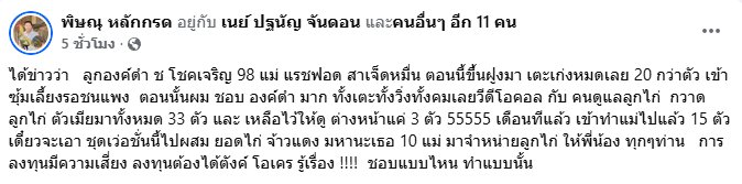เสี่ยเบิร์ด ส.มีสุวรรณทีม ได้ออกมาโพสต์ผ่านเฟสส่วนตัวพูดถึงลูก เจ้าองค์ดำ ช.โขคเจริญ 98 ได้ข่าวว่า   ลูกองค์ดำ ช.โชคเจริญ 98 แม่แรชฟอด สาเจ็ดหมื่น ตอนนี้ขึ้นฝูงมา เตะเก่งหมดเลย 20 กว่าตัว เข้าซุ้มเลี้ยงรอชนแพง  ตอนนั้นผมชอบ องค์ดำ มาก ทั้งเตะ ทั้งวิ่ง ทั้งคม เลยวีดีโอคอลกับคนดูแลลูกไก่  กวาดลูกไก่ตัวเมียมาทั้งหมด 33 ตัว และ เหลือไว้ให้ดู ต่างหน้าแค่ 3 ตัว (55555) เดือนทีแล้ว เข้าทำแม่ไปแล้ว 15 ตัว  เดี๋ยวจะเอา ชุดเวอร์ชั่นนี้ไปผสม