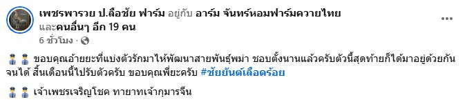 “ขอบคุณอ้ายยะที่แบ่งตัวรักมาให้พัฒนาสายพันธุ์พม่า ชอบตั้งนานแล้วครับตัวนี้ สุดท้ายก็ได้มาอยู่ด้วยกันจนได้ สิ้นเดือนนี้ไปรับตัวครับ ขอบคุณพี่ยะครับ”