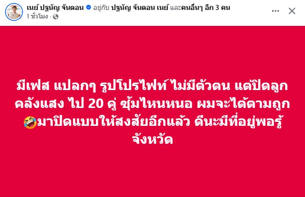 “เฟสบุ๊คแปลกๆ รูปโปรไฟล์ไม่มีตัวตน แต่ปิดลูกคลังแสงไป 20 คู่... ซุ้มไหนหนอ ผมจะได้ตามถูก มาปิดแบบให้สงสัยอีกแล้ว ดีนะมีที่อยู่พอรู้จังหวัด”